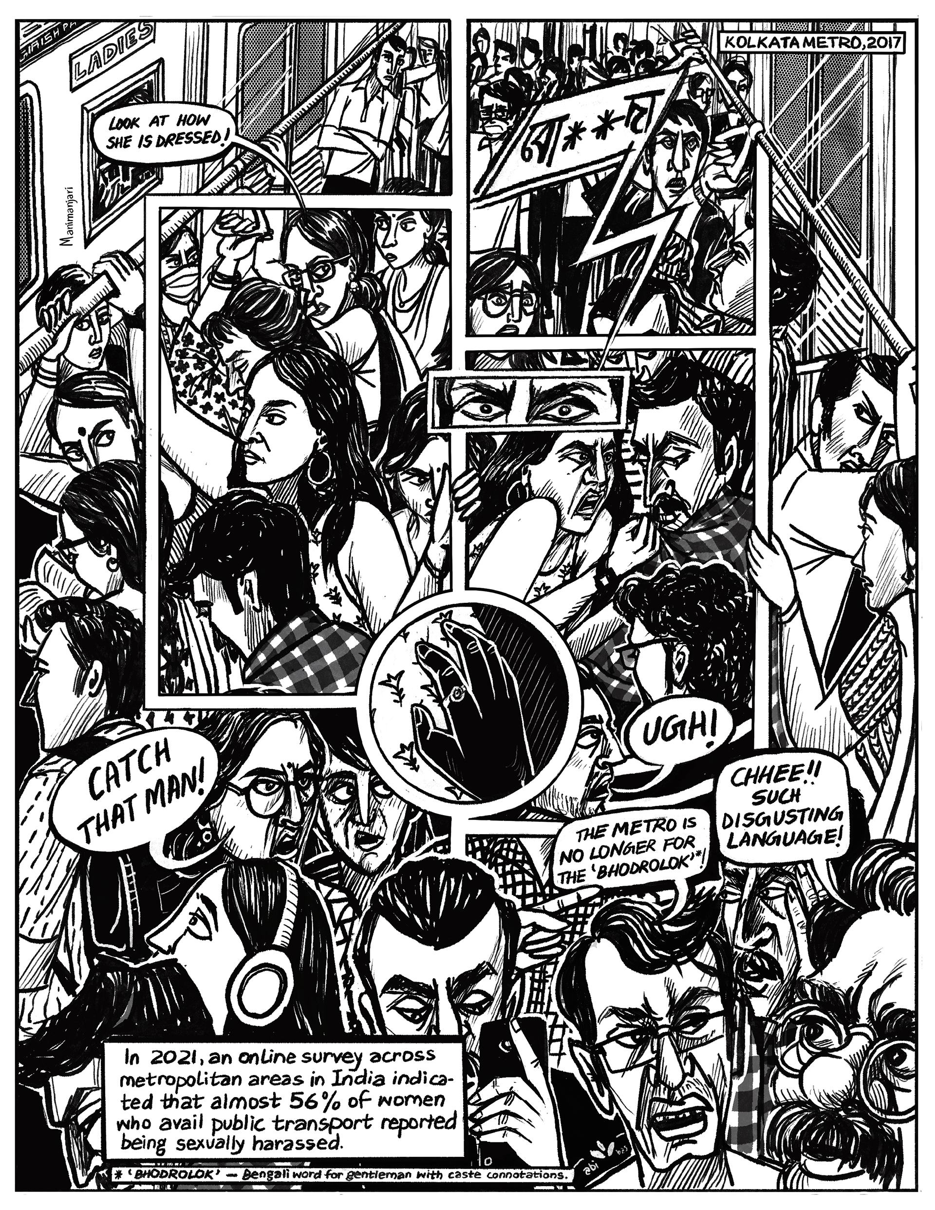 One page super-panel comic on sexual harassment on public transport in India, based on real life events | 2024
